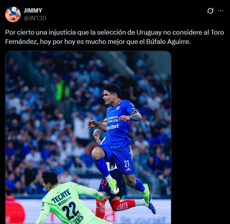 Todo esto comenzó a partir de un posteo de la cuenta @JNT3D, quién expresó: “Por cierto una injusticia que la selección de Uruguay no considere al Toro Fernández, hoy por hoy es mucho mejor que el Búfalo Aguirre“. Ahora en Tigres, el ex América quedó en el ojo del huracán por su bajo rendimiento.
