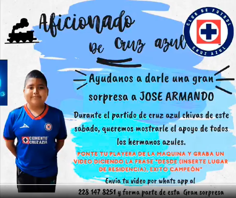 Fue Rafa, una persona cercana a José Armando, quien pidió a la afición de Cruz Azul que se envíe videos de apoyo al pequeño, con el objetivo de que los mismos le sean transmitidos, el próximo sábado, durante el duelo ante el Rebaño. Esto, debido a que lo verá de una manera muy especial.