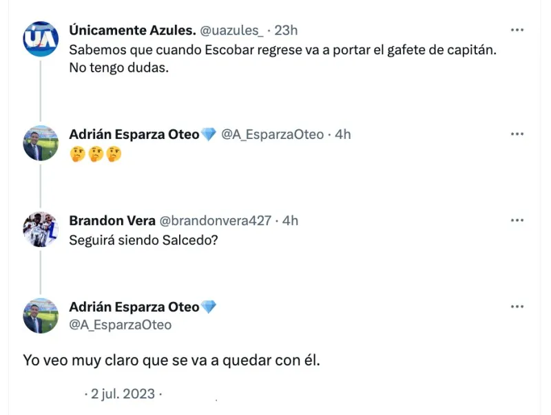 “Sabemos que cuando Escobar regrese va a portar el gafete de capitán. No tengo dudas”, se apuntó en redes sociales. Y a la conversación se sumó Adrián Esparza Oteo, reportero de TUDN especialista en noticias de Cruz Azul, quien reaccionó con escepticismo.