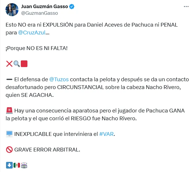 Mientras tanto, el analista arbitral Juan Guzmán Gasso no dudó en calificar la jugada como un grave error arbitral: “Esto NO era ni expulsión ni penal… el defensa de Pachuca gana la pelota y el que corrió el riesgo fue Rivero. Inexplicable que interviniera el VAR”. Por su parte, el reportero Javier Alarcón coincidió en que la decisión fue equivocada: “Me parece equivocada la decisión de penal y roja a favor de Cruz Azul”.