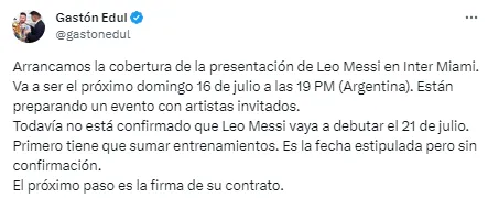 “Primero tiene que firmar contrato, después va a empezar a entrenarse, pero todavía no está confirmado que vaya a debutar el 21 de julio, porque va a depender de cuántos entrenamientos tenga encima y cómo se sienta“, explicó el reconocido periodista.