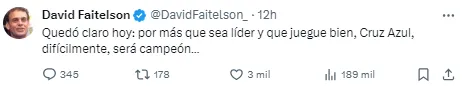 “Quedó claro hoy: por más que sea líder y juegue bien, Cruz Azul, difícilmente, será campeón…”, compartió a través de su cuenta de X. “El América gana merecidamente el Clásico ante Cruz Azul, fue más inteligente y propicio las mejores opciones de gol”, añadió el polémico analista.