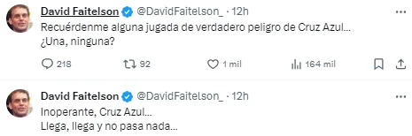 Faitelson siguió con su crítica al juego de Cruz Azul en este Clásico Joven. “Inoperante Cruz Azul, llega, llega y no pasa nada. Recuérdenme alguna jugada de verdadero peligro… ¿Una, ninguna?”, continuó.