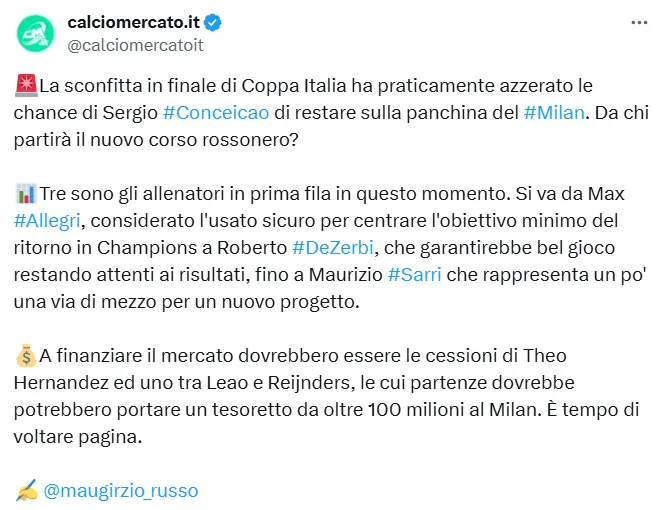 La salida del DT abriría una nueva etapa para el club… y también para Santi Giménez, quien podría verse beneficiado o perjudicado ante la llegada de un nuevo técnico. En este momento, el portal Calciomercato puso varios nombres sobre la mesa: Massimiliano Allegri, Roberto De Zerbi, Maurizio Sarri y Vincenzo Italiani, que viene de ganarle justamente la copa nacional con Bolonia.