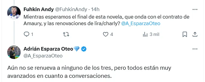 Y en medio de esa incertidumbre, Adrián Esparza Oteo decidió echar luz sobre el tema que trae de cabeza a la nación azul. Ante la consulta de un aficionado en redes sociales, confirmó que, aunque todavía no hay firmas estampadas, las charlas para renovar a Erik Lira, Charly Rodríguez y Amaury Morales están muy avanzadas.