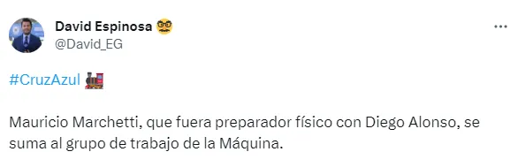 “Mauricio Marchetti, que fuera preparador físico con Diego Alonso, se suma al grupo de trabajo de la Máquina“, informó el periodista de Fox Sports, David Espinosa, desde Mazatlán, durante el partido de Cruz Azul de este viernes en la Jornada 8.