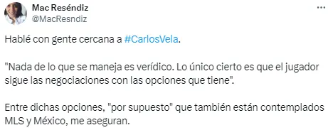 “Hablé con gente cercana a Carlos Vela. ‘Nada de lo que se maneja es verídico. Lo único cierto es que el jugador sigue las negociaciones con las opciones que tiene’. Entre dichas opciones, ‘por supuesto’ que también están contemplados MLS y México, me aseguran”, escribió la reportera.