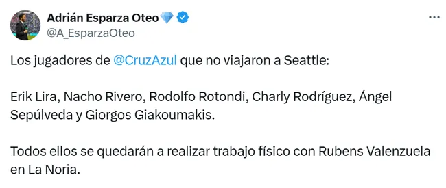 “Los jugadores de Cruz Azul que no viajaron a Seattle: Erik Lira, Nacho Rivero, Rodolfo Rotondi, Charly Rodríguez, Ángel Sepúlveda y Giorgos Giakoumakis. Todos ellos se quedarán a realizar trabajo físico con Rubens Valenzuela en La Noria“, informó el reconocido reportero.