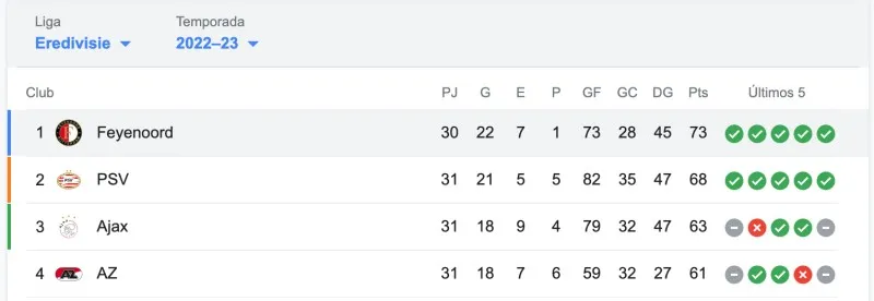 Tan solo faltan cuatro fechas para que se complete la temporada de la liga holandesa. Y de cara al cierre del torneo, destaca que el conjunto de Santi Giménez, canterano de Cruz Azul, tiene una ventaja de cinco puntos sobre el PSV, su más cercano perseguidor que este sábado logró una importante victoria.