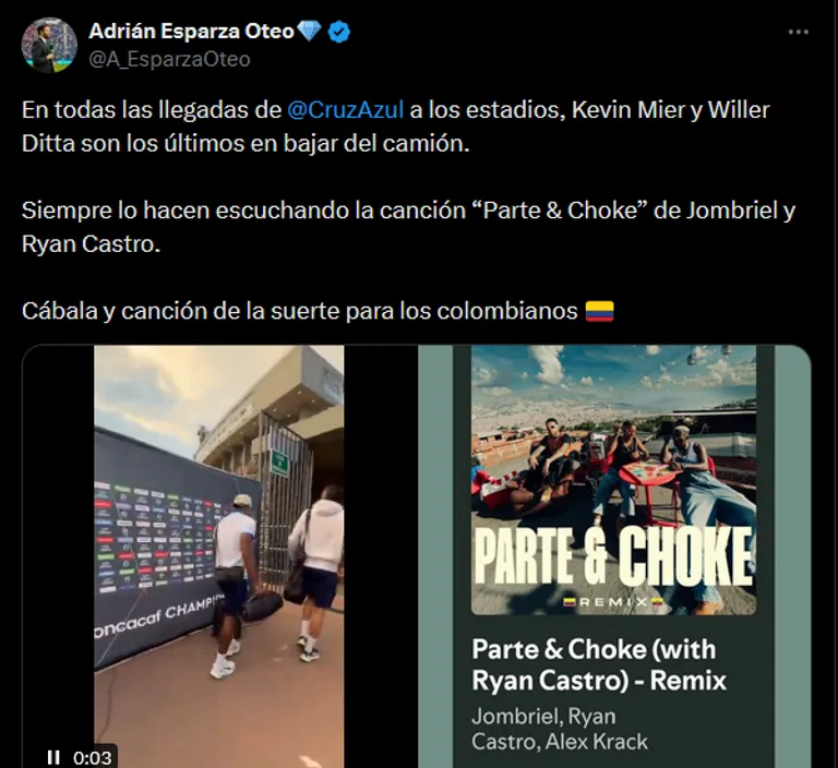 “En todas las llegadas de Cruz Azul a los estadios, Kevin Mier y Willer Ditta son los últimos en bajar del camión. Siempre lo hacen escuchando la canción “Parte & Choke” de Jombriel y Ryan Castro. Cábala y canción de la suerte para los colombianos”, expresó el reportero de TUDN. ¡Que sigan así!