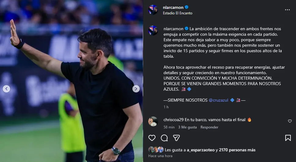 Luego también agregó: “Ahora toca aprovechar el receso para recuperar energías, ajustar detalles y seguir creciendo en nuestro funcionamiento. Unidos, con convicción y mucha determinación, porque se vienen grandes momentos para nosotros azules.“, concluyó el estratega con pasado en Necaxa.