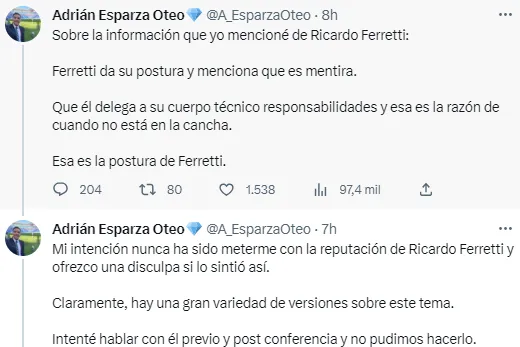 A quien hacía referencia Ricardo Ferretti es Adrián Esparza Oteo, trabajador de la cadena TUDN y cubre el día a día del equipo de La Noria. Además de un vivo de Instagram en donde ratificó sus fuentes, el propio reportero realizó un descargo a través de su Twitter, donde ofreció una disculpa