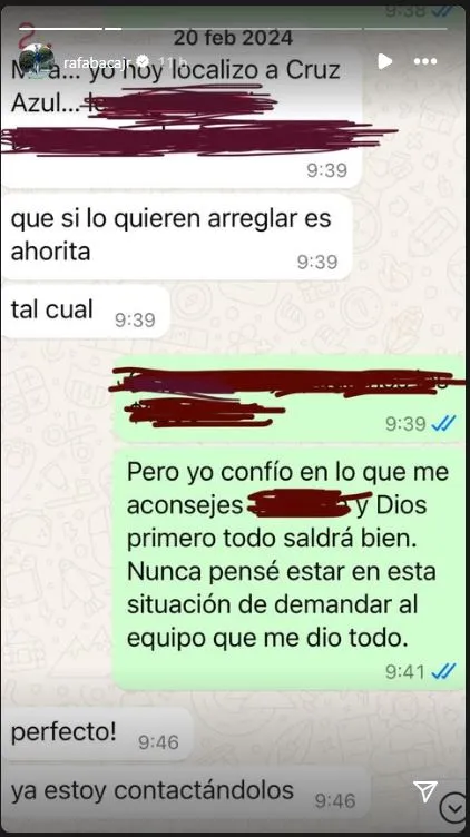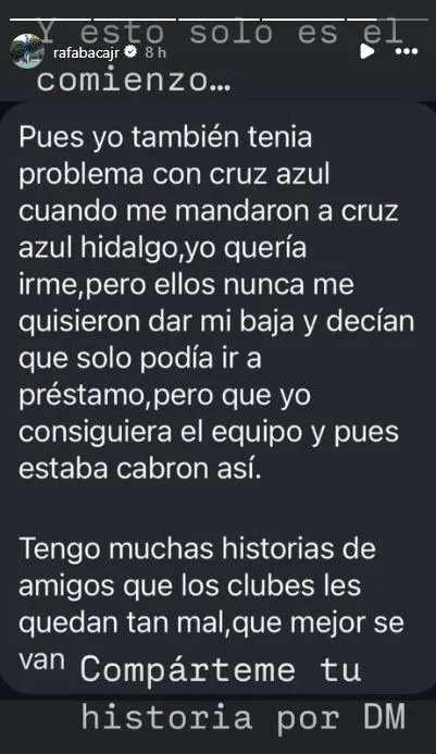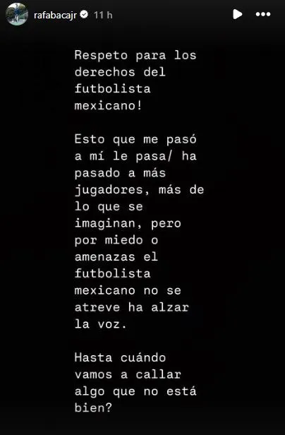“Confío en Dios que todo saldrá bien. Nunca pensé estar en esta situación de demandar al equipo que me dio todo”, escribió Rafael Baca en una de las historias de su Instagram personal. En la misma línea, también dejó un mensaje para todos los jugadores mexicanos: “Respeto para los derechos de los futbolistas mexicanos! Esto que me pasó a mí le pasa (le ha pasado) a más jugadores, más de lo que se imaginan…”.