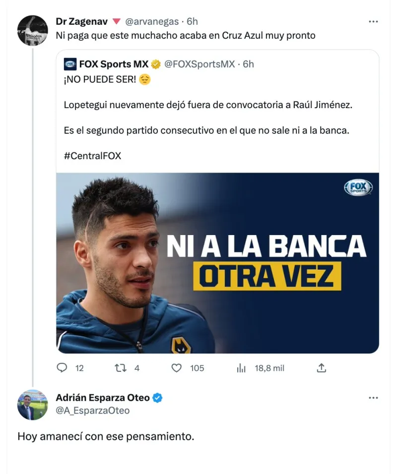 Y en ese contexto, destacó una publicación que colocó al futbolista de 31 años en la órbita de La Máquina. “Este muchacho acabará en Cruz Azul muy pronto”, escribió un usuario en Twitter, haciendo referencia a Raúl Jiménez. “Hoy amanecí con ese pensamiento”, comentó Adrián Esparza Oteo, reportero de TUDN especialista en noticias del equipo cementero, en la misma red social.