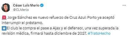 “Jorge Sánchez es nuevo refuerzo de Cruz Azul: Porto ya aceptó interrumpir el préstamo. El club le compra el pase a Ajax y el defensor, una vez superada la revisión médica, firmará hasta diciembre de 2027“, publicó el reconocido periodista.