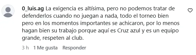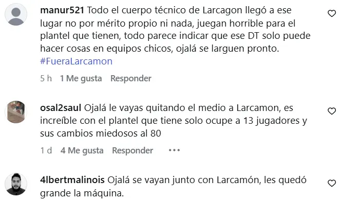 En la publicación donde Juan Cruz Mónaco realizó un breve balance del año y mensaje en vistas al 2026, algunos aficionados de La Máquina arremetieron contra el cuerpo técnico de Nicolás Larcamón. El inconformismo fue exhibido al leerse frases del estilo “esto no es Puebla ni León” u “ojalá se vayan pronto de Cruz Azul”.