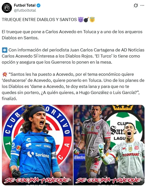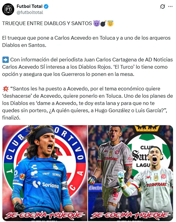 La posibilidad más avanzada, según la misma fuente, contemplaría un trueque directo: Acevedo a Toluca, mientras Santos recibe dinero y elige entre Hugo González o Luis García para cubrir la posición. Un movimiento importante considerando el historial y valor del guardameta lagunero, que definitivamente lo alejaría de cualquier arribo a La Noria.