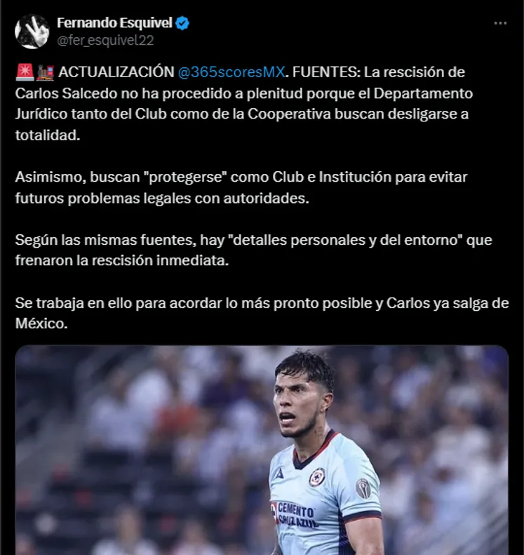 El colega Fernando Esquivel acaba de ampliar dicha información, descolocando a los aficionados: “La rescisión de Carlos Salcedo no ha procedido a plenitud porque el Departamento Jurídico tanto del Club como de la Cooperativa buscan desligarse a totalidad“, comenzó diciendo Lecanda argumentando que Cruz Azul no quiere problemas futuros.