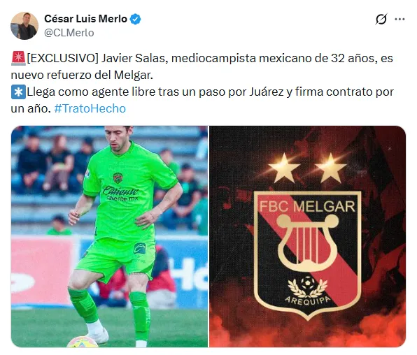 El DT campeón en Cruz Azul del Guard1anes 2021 decidió darle la oportunidad de incorporarse a Melgar. Fue el gurú del mercado, César Luis Merlo, quien anunció la llegada del volante mexicano como refuerzo para la temporada 2026, sumándose a otro compatriota, Jesús Alcántar, quien llega en calidad de préstamo desde Necaxa.