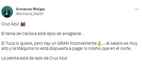 Es así, que a pesar de que Carioca ha sido una petición directa por parte del Tuca Ferretti, en caso de no llegar a un acuerdo por su sueldo, el mediocampista se alejaría de La Máquina y no arribaría a La Noria en el próximo mercado de pases para el Apertura 2023.