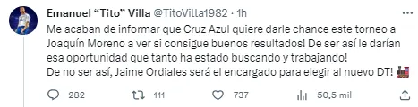 “Me acaban de informar que Cruz Azul quiere darle chance este torneo a Joaquín Moreno a ver si consigue buenos resultados! De ser así le darían esa oportunidad que tanto ha estado buscando y trabajando! De no ser así, Jaime Ordiales será el encargado para elegir al nuevo DT!”, escribió Tito en sus redes.