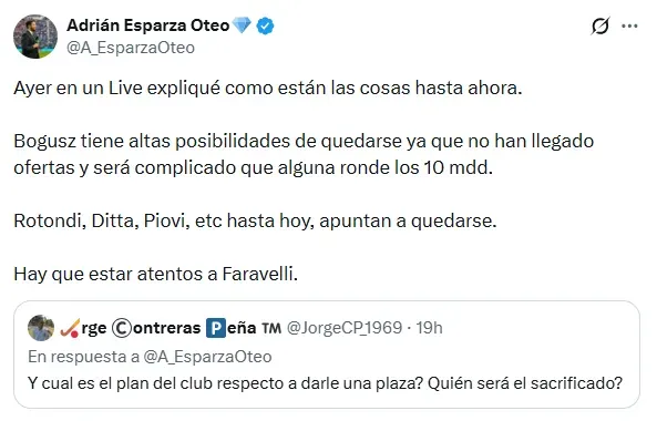 El punto de quiebre llegó con un posteo claro y directo de Adrián Esparza Oteo en X, donde expuso la situación real que hoy rodea a Mateusz Bogusz. El periodista, que sigue de cerca el día a día del club, dejó en evidencia que la narrativa de una salida inminente no se sostiene con los hechos.