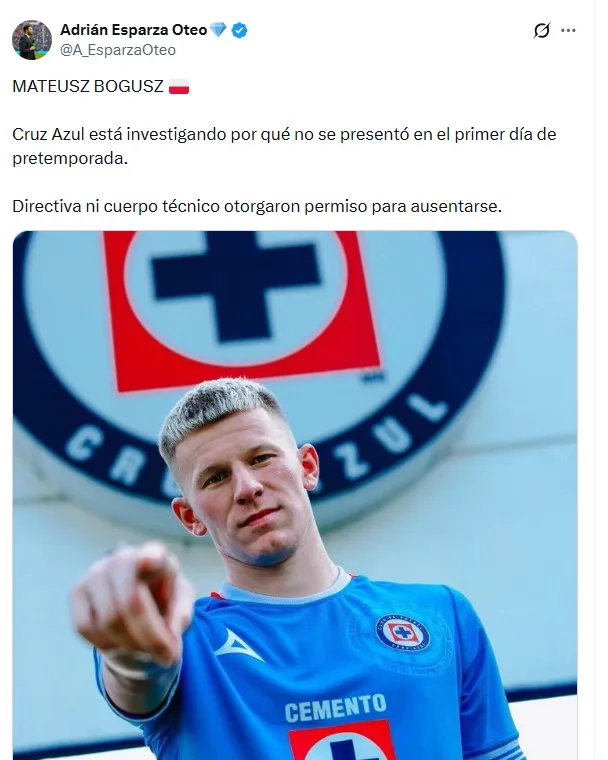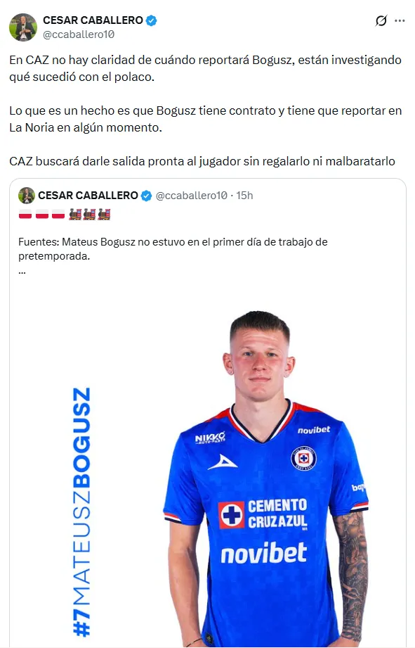 De acuerdo con información de Adrián Esparza Oteo, en Cruz Azul se encuentran investigando por qué Bogusz no se presentó al arranque de la pretemporada. Además, aclaró que ni la directiva ni el cuerpo técnico otorgaron permiso para su ausencia.