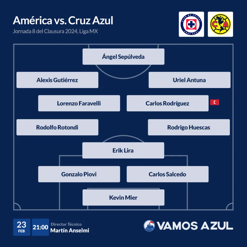 De esta manera, y en caso de que Martín Anselmi repita su alineación con un 5-4 1, el 11 quedaría de la siguiente forma: con Kevin Mier como inamovible del arco; resguardado por Carlos Salcedo y Gonzalo Piovi como centrales, así como Erik Lira como líbero.