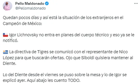 “La directiva de Tigres se comunicó con el representante de Nico López para que buscarán ofertas. Ojo que Siboldi quisiera mantener al Diente“, escribió Maldonado a través de su cuenta de Twiter. Sin embargo…