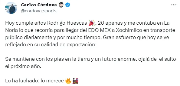 “Me contaba en La Noria lo que recorría para llegar del Estado de México a Xochimilco en transporte público diariamente y por mucho tiempo. Gran esfuerzo que hoy se ve reflejado en su calidad de exportación. Se mantiene con los pies en la tierra y un futuro enorme, ojalá de el salto el próximo año“, escribió el periodista.