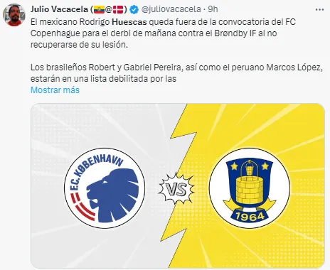 Sin embargo, se confirmó lo que nadie esperaba sobre el joven canterano. En las últimas horas, Copenhague hizo oficial su convocatoria para el duelo ante Brondby y no incluyó a Rodrigo Huescas entre sus filas.