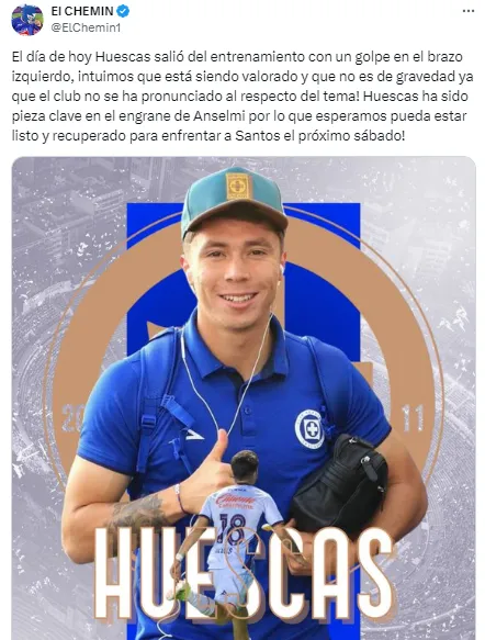 El Chemin, usuario identificado con Cruz Azul que habitualmente documenta la salida de los futbolistas de las instalaciones de La Noria, compartió en su cuenta de X un video donde se lo observa al joven extremo salir con su brazo izquierdo inmovilizado para presuntamente dirigirse rumbo al hospital.