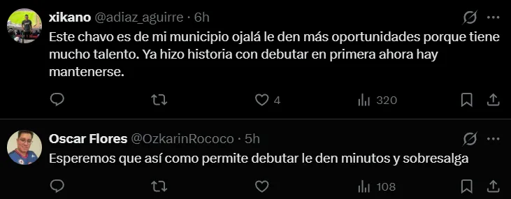A través de las redes sociales, los aficionados realizaron comentarios positivos en favor de Rogelio González, a quien le desearon una gran carrera. Además, muchos pronosticaron que le dará sus frutos a Cruz Azul en el futuro. “Se le vieron ganas, ojalá le sigan dando minutos”, “una locura de jugador” o “bendiciones, ojalá tengas una buena carrera y nos des alegrías”, fueron algunos de los mensajes que se leyeron.
