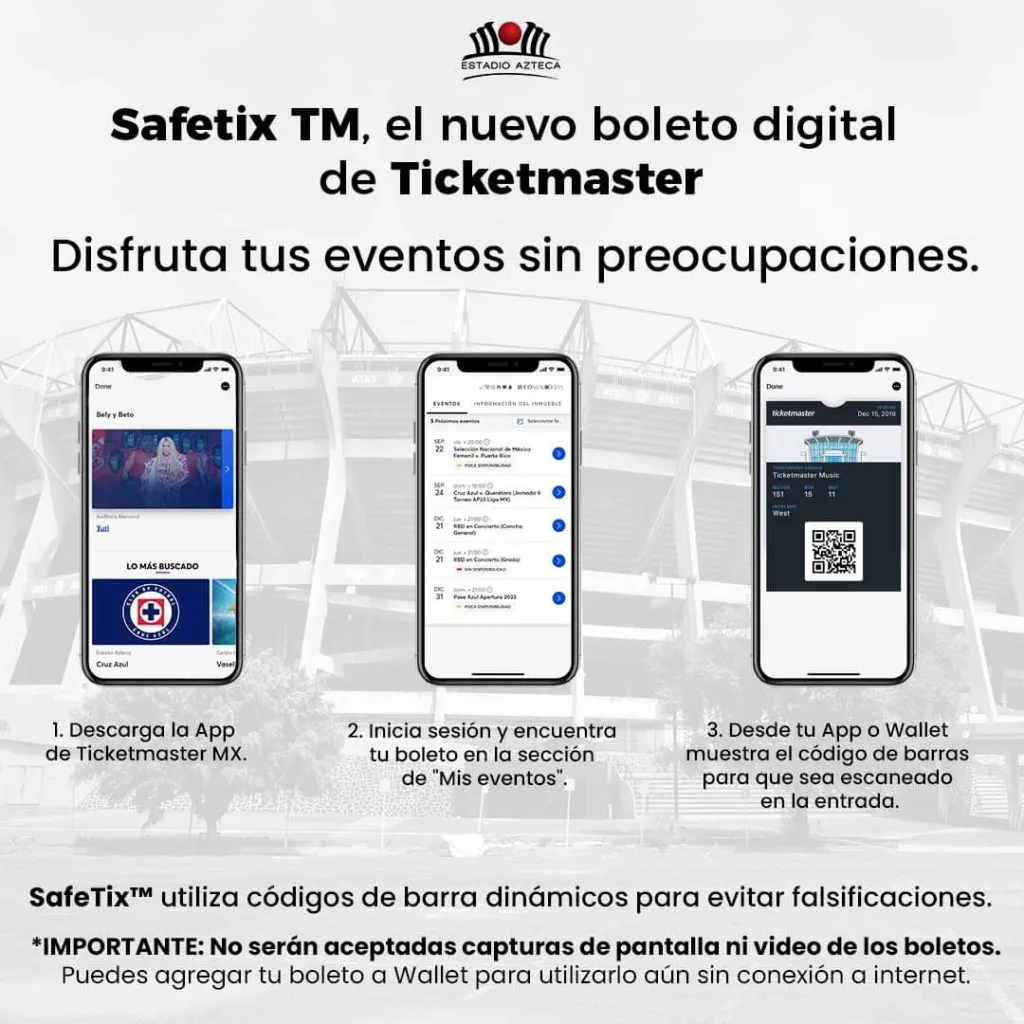 “La entrada es aún más fácil y segura con 𝗧𝗶𝗰𝗸𝗲𝘁𝗺𝗮𝘀𝘁𝗲𝗿 𝗦𝗮𝗳𝗲𝗧𝗶𝘅. Tu boleto es un código de barras dinámico que se actualiza cada 15 segundos. Muestra tu boleto en tu App o Wallet”, así lo presumió el propio Estadio Azteca, de cara al partido de Cruz Azul ante Pumas, pues el Clásico ya contará con este novedoso sistema.