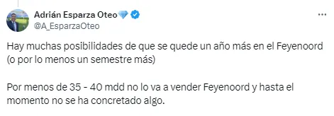 Y es que, de acuerdo con información de Adrián Esparza, periodista de TUDN, el exgoleador de La Máquina podría quedarse en el Feyenoord, al menos un semestre más. Esto, debido a que el equipo de Róterdam le puso un precio bastante alto a su ficha.