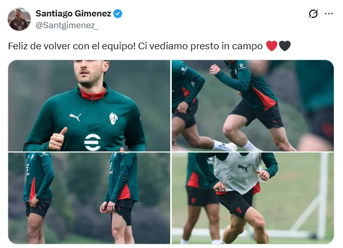 En medio de ese regreso tan esperado, Santi también rompió el silencio en sus redes sociales con un mensaje que rápidamente llamó la atención de los aficionados. “Feliz de volver con el equipo! Ci vediamo presto in campo (NdR: Nos vemos pronto en el campo).” Breve pero contundente, refleja el ánimo del mexicano, que ya empieza a proyectar su vuelta oficial a los partidos.