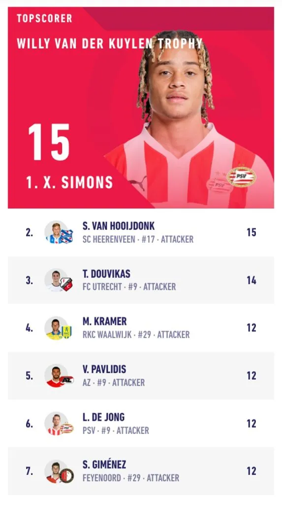Santiago Giménez tiene 12 goles y se ubica a solo tres tantos de los líderes en ese renglón: el centrocampista Xavi Simons (PSV) y el delantero Sydney van Hooijdonk (Heerenveen).