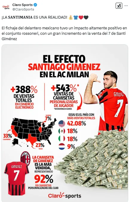 La prueba más clara de ello apunta a la venta de camisetas del conjunto rossonero. Y es que, de acuerdo con información de Claro Sports, aumentó un 543% la venta del jersey personalizado con el apellido Giménez y el histórico 7 que portará en su nueva aventura europea.