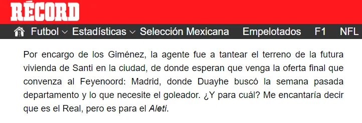 “Por encargo de los Giménez, la agente fue a tantear el terreno de la futura vivienda de Santi en la ciudad, de donde esperan que venga la oferta final que convenza al Feyenoord: Madrid, donde Duayhe buscó la semana pasada departamento y lo que necesite el goleador. ¿Y para cuál? Me encantaría decir que es el Real, pero es para el Aleti“, publicó este jueves el anónimo columnista en dicho diario.