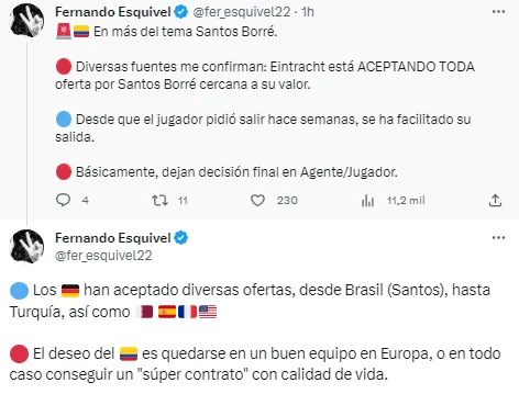 De acuerdo a información del periodista Fernando Esquivel, “Eintracht está ACEPTANDO TODA oferta por Santos Borré cercana a su valor”, pues “desde que el jugador pidió salir hace semanas, se ha facilitado su salida, dejando la decisión final en agente/jugador“.