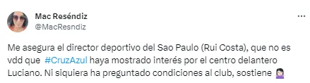 “Me asegura el director deportivo del Sao Paulo (Rui Costa), que no es verdad que Cruz Azul haya mostrado interés por el centro delantero Luciano. Ni siquiera ha preguntado condiciones al club, sostiene”, fue el mensaje que publicó la periodista a través de su cuenta de Twitter.