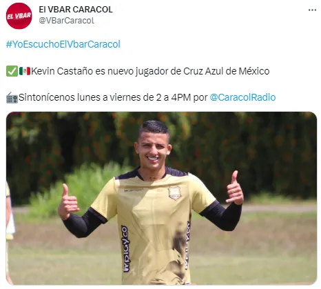 De acuerdo a información surgida desde Colombia y replicada por referentes periodísticos como Hugo Ramos o León Lecanda, Kevin Castaño es nuevo refuerzo de Cruz Azul para el Apertura 2023, después de que se haya arribado a un acuerdo entre ambas instituciones. El futbolista viajaría a México en los próximos días para sumarse a los trabajos del primer equipo.