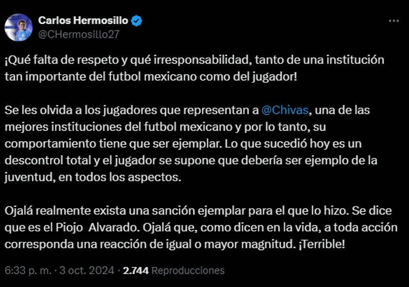 “Lo que sucedió hoy es un descontrol total y el jugador se supone que debería ser ejemplo de la juventud, en todos los aspectos. Ojalá realmente exista una sanción ejemplar para el que lo hizo. Se dice que es el Piojo Alvarado. Ojalá que, como dicen en la vida, a toda acción corresponda una reacción de igual o mayor magnitud. ¡Terrible!”, sentenció el Gigante de Cerro Azul en su perfil de X.