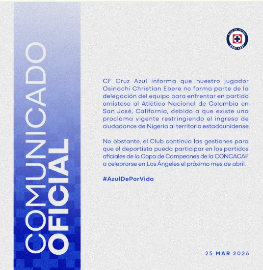 “Cruz Azul informa que nuestro jugador Christian Ebere no forma parte de la delegación del equipo para enfrentar en partido amistoso al Atlético Nacional de Colombia en San José, California, debido a que existe una proclama vigente restringiendo el ingreso de ciudadanos de Nigeria al territorio estadounidense“, se lee en la primera parte del comunicado cementero.