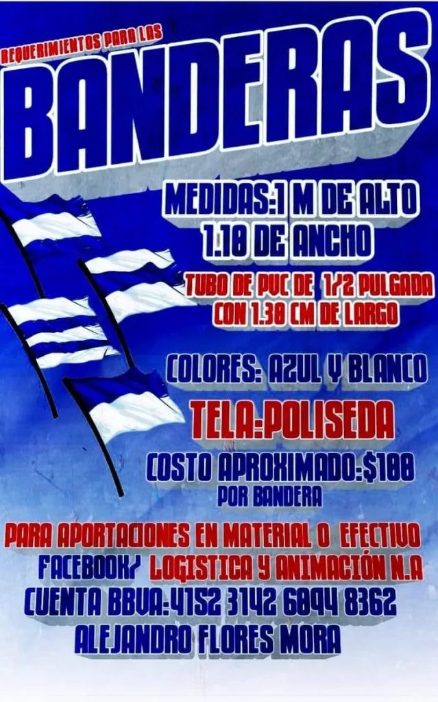De esta manera, la agrupación cementera brindó las especificaciones que debe tener cada bandera para poder ingresar al Estadio Azul, así como los diseños que pueden tener, obviamente, en color azul y blanco.