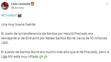 “Una muy buena fuente: El costo de la transferencia de Santos por Harold Preciado era semejante al de Eintracht por Rafael Santos Borré: cerca de 10 millones USD. El sueldo de Santos Borré era mucho más alto que el de Preciado, pero la Liga MX está muy inflada”, informó el periodista.