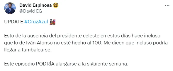 Y es que, el motivo apuntaría directamente al presidente cementero, Víctor Manuel Velázquez, quien, por sorprendente que parezca y en plena reestructuración del equipo, no se encontraría presente en la Ciudad de México. Así lo dio a conocer el periodista de Fox Sports, David Espinosa.