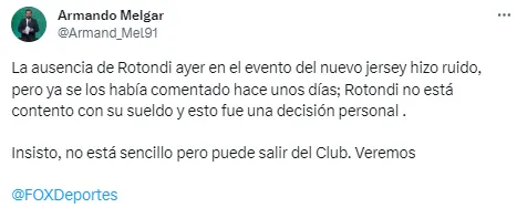En días pasados surgió la versión que indicaba que el extremo argentino había solicitado un aumento salarial para permanecer con La Máquina Cementera de cara al Torneo Apertura 2023. “Carlos Rotondi puede ser baja en Cruz Azul si no le dan aumento salarial”, se afirmaba desde el sitio web de TUDN.