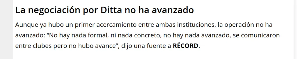 Tigres apareció sobre la mesa como uno de los clubes que estarían interesados en hacerse con los servicios de Ditta. Desde el conjunto felino habrían iniciado un acercamiento informal; pero, según la reportera Iliany Aparicio, de diario Récord, la negociación no avanzó y, por ahora, todo se mantiene en dicho interés: “no hay nada formal, ni nada concreto. Se comunicaron entre clubes, pero no hubo avance”.