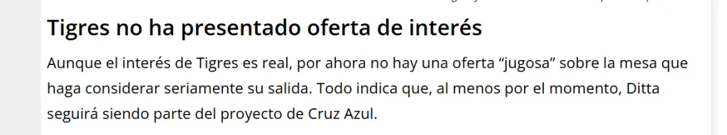A pesar del interés genuino por parte de Tigres, Cruz Azul no habría recibido ninguna oferta que los lleve a considerar seriamente la venta de su zaguero: “Aunque el interés de Tigres es real, por ahora no hay una oferta ‘jugosa’ sobre la mesa que haga considerar seriamente su salida“.